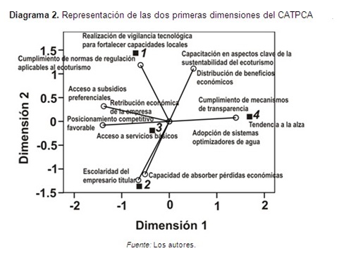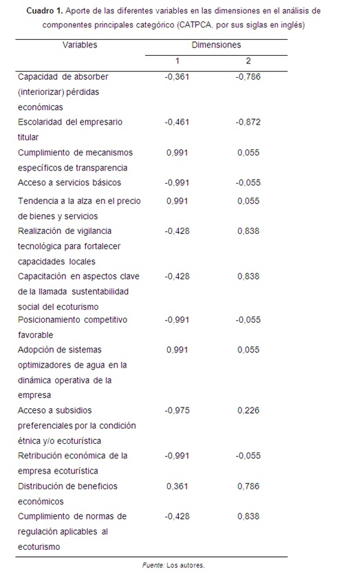 grandes (> 0,5) en cada dimensión, indican que la variable está fuertemente asociada con la dimensión referida. La primera dimensión separa con valores positivos las variables: Cumplimiento de mecanismos específicos de transparencia y rendición de cuentas en torno a los subsidios y/o financiamientos otorgados por solicitud de alguna institución pública y/o privada (eje institucional), Tendencia a la alza en el precio de bienes y servicios diferenciados que se ofertan en la empresa (eje del entorno) y Adopción de sistemas optimizadores de agua (captación de agua pluvial, medidas y dispositivos ahorradores, reutilización del agua tratada y tratamiento de aguas residuales) en la dinámica operativa de la empresa (eje medioambiental), mientras que de manera negativa el Acceso a servicios básicos (energía eléctrica, agua potable, drenaje y salud) en la empresa y en la vivienda del titular de la empresa (eje social), Posicionamiento competitivo favorable (eje del entorno) y Retribución económica de la empresa ecoturística (eje económico).
