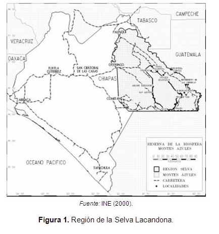 La investigación se realizó en la Reserva de la Biosfera Montes Azules (REBIMA), también conocida como Selva Lacandona, establecida en los municipios de Ocosingo y Maravilla Tenejapa en el estado de Chiapas: i) es la principal selva tropical de México, con una superficie de 331.200 hectáreas, es decir, 37,45% de toda la superficie protegida en la entidad bajo el esquema de área natural protegida (INEGI9, 2011) decretado en 1978, ii) la REBIMA concentra aproximadamente 31% de las especies de mamíferos, 48% de las aves y 44% de las mariposas diurnas (De la Maza, 2006, p. 10), iii) produce 30% del agua de las cuencas más importantes de México: Usumacinta-Grijalva, además, los ríos de