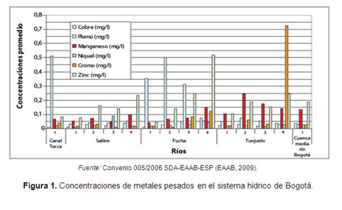 En la Figura 1 se observa que el cromo es el metal pesado con mayor concentración en el sistema hídrico de Bogotá, afectando al río Tunjuelito por actividad de curtiembres ubicadas en el tramo 4 (CAR, 2009). El nivel de cromo se encuentra en concentraciones superiores a 0,1 mg/L, límite admisible del agua para uso agrícola (Ministerio de Agricultura, 1984).