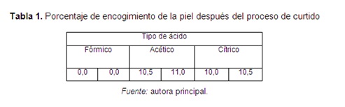 Como se observa en la Tabla 1, solamente el ácido fórmico presentó buenos resultados, mostrando combinación del cromo con las cadenas peptídicas del colágeno de la piel, lo que se manifiesta en el nulo encogimiento del cuero. Los ácidos acético y cítrico presentan elevado porcentaje de encogimiento, siendo cero el requerido para cuero destinado a calzado colegial o para confección.