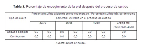 En la Tabla 2 se observa que las pieles curtidas utilizando todas las mezclas ensayadas de sulfato básico de cromo regenerado con sulfato básico de cromo comercial no presentaron encogimiento, lo que significa que la absorción de cromo fue suficiente para evitar la degradación de estas.