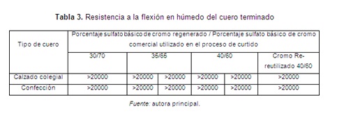 Los resultados de resistencia a la flexión que se muestran en la Tabla 3, indican que la calidad del cuero obtenido mezclando las sales de cromo regenerado y comercial, es la requerida, superando los 20.000 ciclos en húmedo.