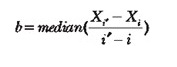 Donde b es la estimación de la pendiente de una tendencia, Xi es el dato medido en el tiempo i, Xj es el dato medido en el tiempo j, e i es el tiempo después del tiempo j.