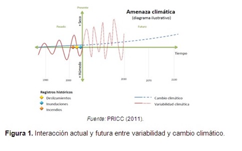 Se considera que la variabilidad y el cambio climático tienen una relación directa y que interactúan constantemente asociados a los cambios en el forzamiento radiativo no natural, que tiene su origen en el efecto invernadero antropogénico. En general, se puede decir que el cambio climático vuelve más extremos e intensos los fenómenos de variabilidad climática, siendo posible en los próximos años un aumento de eventos extremos climáticos (que desencadenan inundaciones, deslizamientos e incendios forestales) asociados a los fenómenos ENSO (El Niño– La Niña) (Figura 1).