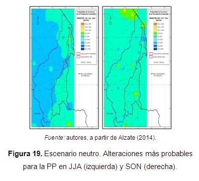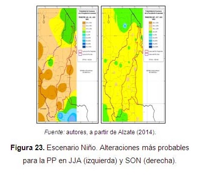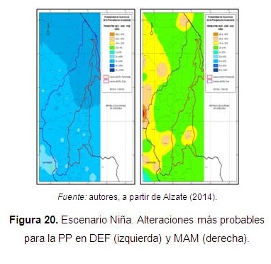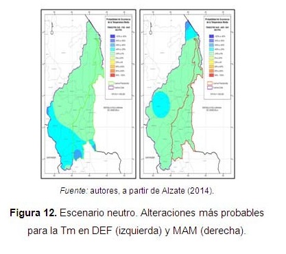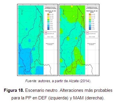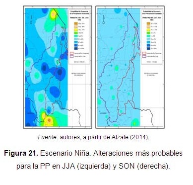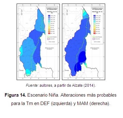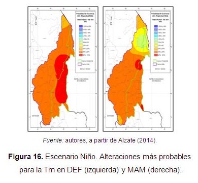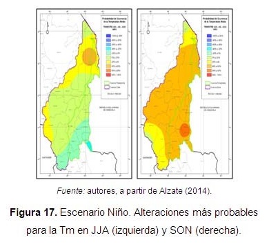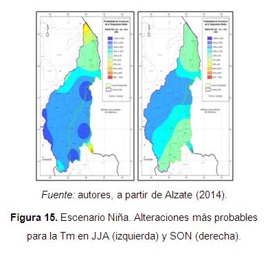 Con los resultados obtenidos se generaron mapas de la probabilidad de la ocurrencia de la variable en cada categoría (por encima, dentro y por debajo de lo normal) por trimestres para los eventos ENSO, utilizando el método de interpolación IDW. Estas salidas cartográficas permiten identificar zonas con diversas probabilidades de ocurrencia de alteraciones de los valores climáticos durante eventos ENSO.