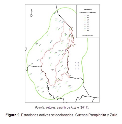 Con ayuda de un Sistema de Información Geográfico (SIG) y a partir de la capa del catálogo de estaciones del IDEAM (2013), fueron preseleccionadas las estaciones con información de precipitaciones y temperaturas a incluir en el análisis de variabilidad climática. La selección se realizó a partir de un búfer de 30 km a partir del límite de la cuenca de los ríos Pamplonita y Zulia, con el fin de incluir en la selección estaciones vecinas que permiten hacer análisis más robustos para el área de interés y disminuir la probabilidad de dejar alguna zona sin información. (Figura 2).