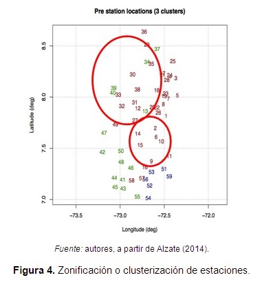 del IDEAM utilizadas. El proceso de homogenización permitió identificar 2 regiones diferenciadas, una que recibe la influencia climática de la Orinoquía y que se ubica hacía el suroriente, otra que se localiza en al sur y centro de la cuenca Pamplonita. En la Figura 4 se muestra la zonificación de las estaciones de acuerdo a la estacionalidad y cantidad de lluvias.