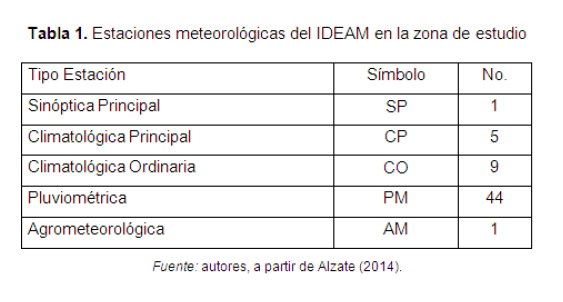De esta manera, en el desarrollo del trabajo, se identificaron 170 estaciones climáticas potenciales. Se incluyeron en el análisis 60 estaciones IDEAM con un periodo mínimo de extensión del registro de 30 años cada una, como sugiere la Organización Meteorológica Mundial (OMM). El número y tipo de estaciones utilizadas se muestra a continuación: