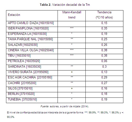 El Instituto de Hidrología, Meteorología y Estudios Ambientales (IDEAM, 2010) menciona que la temperatura media del país está aumentando a una tasa de cambio de 0,13°C por década para el período 1971-2000, y el departamento de Norte de Santander es uno de los que ha sentido mayormente este aumento. De la misma forma, la temperatura media en el territorio nacional continuará incrementándose durante el transcurrir del siglo XXI de tal manera que para el período 2011-2040 habría aumentado en 1,4°C, para 2041-2070 en 2,4°C y para 2071-2100 en 3,2°C. Los aumentos más significativos de la temperatura media se esperan en gran parte de las regiones Caribe y Andina, especialmente en los departamentos de Sucre, Norte de Santander, Risaralda, Huila y Tolima.