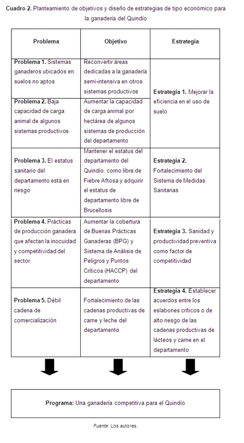 Planteamiento de objetivos y diseño de estrategias. A cada uno de los cinco problemas principales de tipo económico productivo, se le creó un objetivo, estos se agruparon en cuatro estrategias para su solución, que en conjunto conforman la política económica del plan de desarrollo, la cual se llamó “Una ganadería competitiva para el Quindío” (Cuadro 2).