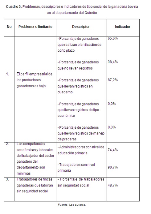 De acuerdo con el análisis de los planes de desarrollo articulado a la caracterización y tipificación de sistemas de la ganadería bovina en el departamento, se detectaron tres problemas o limitantes principales de tipo social, a los cuales se les definió su respectivo descriptor e indicador (Cuadro 3).