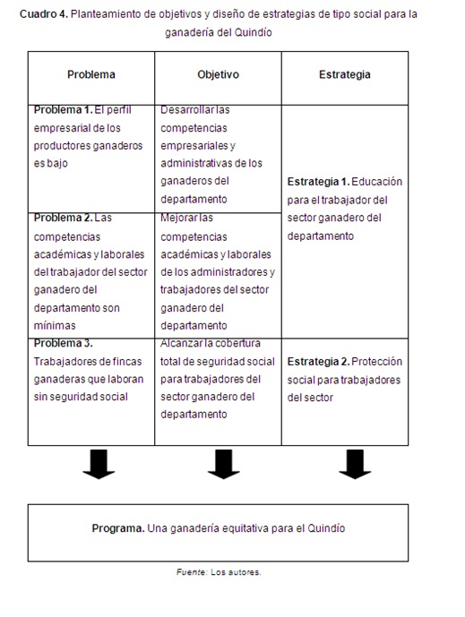 Planteamiento de objetivos y diseño de estrategias. De acuerdo con el análisis de los sistemas de producción articulado a los planes de desarrollo se encontraron tres problemas principales de tipo social, los cuales se agruparon en dos estrategias para su solución, que en conjunto conforman la política social del plan de desarrollo, la cual se llamó “Una ganadería equitativa para el Quindío” (Cuadro 4).