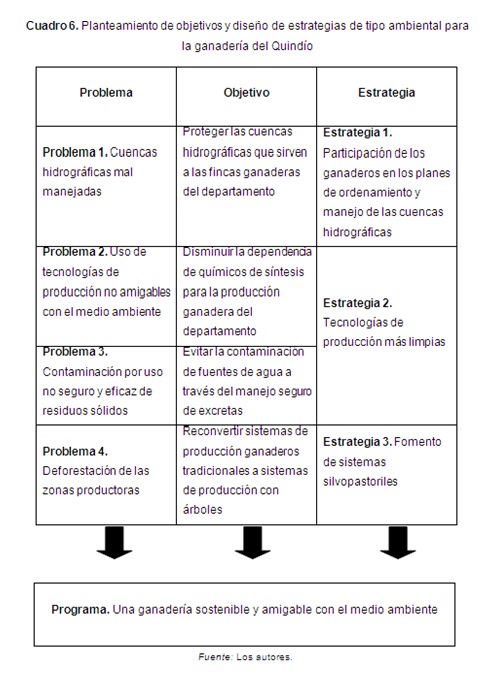 Planteamiento de objetivos y diseño de estrategias. De acuerdo con el análisis de los sistemas de producción articulado a los planes de desarrollo se encontraron cuatro problemas principales de tipo ambiental, los cuales se agruparon en tres estrategias para su solución, que en conjunto conforman la política económica del plan de desarrollo, la cual se llamó “Una ganadería sostenible y amigable con el medio ambiente” (Cuadro 6).