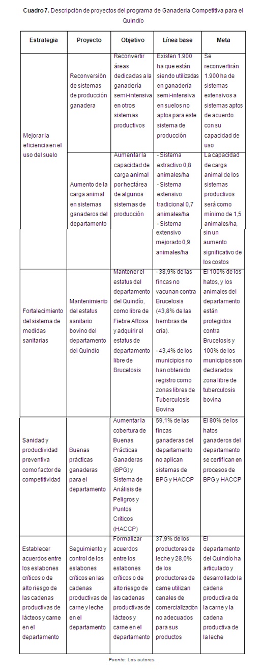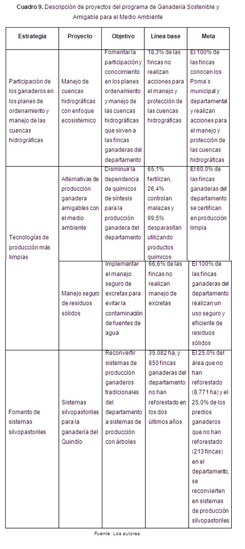 environmental problems of first importance for the livestock of Quindío were found. Each problem was assigned an objective for its solution and objectives were grouped into strategies. From the strategies found, three programs were created: “A competitive livestock for Quindío”, “A fair livestock for Quindío” and “A sustainable and environment friendly livestock”. From the three programs set and their own strategies a total of twelve projects were generated that must be undertaken in order to develop livestock in the Department of Quindío.