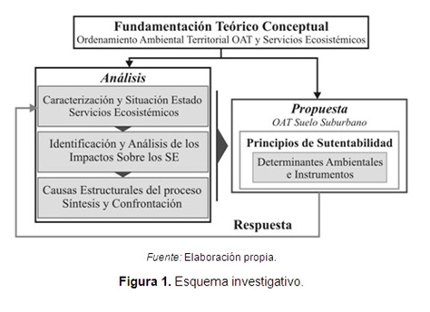 Con base en los conceptos teóricos fundamentales que estructuran la base teórica y conceptual del trabajo de investigación, se realiza una caracterización del proceso de suburbanización y del estado de los SE en dicho suelo, luego se identifican y priorizan las causas estructurales y las variables (subprocesos y aspectos) de dicho proceso, y se realiza el análisis de estas variables en el marco de su afectación e impacto sobre los SE en el periodo de vigencia del POT. (Ver Figura 1).