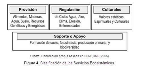 Se entiende, entonces, que los Bienes Ambientales son objetos y recursos tangibles producto de la naturaleza directamente valorados y aprovechados por el hombre y que se transforman y agotan cuando son utilizados; mientras que los Servicios Ambientales son aquellas funciones y procesos de los ecosistemas que generan beneficios y bienestar para las personas y las comunidades (Zúñiga, 2012). En esta misma línea, la Evaluación de los Ecosistemas del Milenio –EEM– (ONU, 2005) clasifica los “Servicios Ecosistémicos” en dos tipos: directos e indirectos. Se consideran beneficios directos la producción de provisiones o bienes (alimentos, maderas, agua, suelo, recursos genéticos y energéticos), o la regulación de ciclos (agua, aire, erosión, enfermedades). Los beneficios indirectos se relacionan con el funcionamiento de procesos del ecosistema (servicios de apoyo o soporte) como la formación de suelo, la fotosíntesis, producción primaria, y la biodiversidad; y la oferta de beneficios no materiales (servicios culturales), como los valores estéticos y espirituales y culturales, o las oportunidades de recreación. Así múltiples documentos clasifican de forma general los SE como de soporte o apoyo, provisión, regulación, y culturales. (Ver Figura 4).