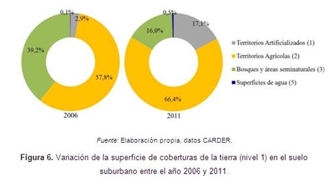 En un análisis comparativo de la extensión de las coberturas de la tierra entre los años 2006 y 2011, se observa una disminución de la participación de Bosques y Áreas Seminaturales (coberturas con mayor valoración en prestación de SE) en un 23,2% sobre el total del territorio de estudio, esta cobertura ha sido reemplazada por coberturas asociadas a usos antrópicos del suelo como Territorios Agrícolas y Territorios Artificializados, este último presenta un aumento significativo de 6 veces su extensión dentro del período analizado. (Ver Figura 6).