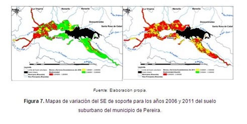 El análisis comparativo también permite identificar cambios drásticos en la extensión de las coberturas. En el período analizado los Territorios Artificializados presentaron un aumento en su extensión cerca al 490% en relación a su extensión inicial, contrario a la reducción en un 60% de la extensión de las coberturas asociadas a Bosques y Áreas Seminaturales dentro del mismo período, por otro lado los Territorios Agrícolas aumentaron una tasa de 15,0% con respecto al 2006. Es así como, conociendo el nivel de participación de las coberturas de la tierra en la prestación de SE, y el cambio en la extensión de estas coberturas entre los años 2006 y 2011, se realiza un análisis de la variación del nivel de prestación por cada uno de los grupos de SE (soporte, regulación, provisión y culturales) en el período de análisis.