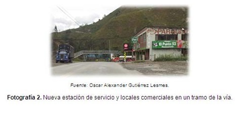 Debido al modelo económico de inversión de Colombia, la vía continuará siendo concesionada para construcción y reparación, estas concesiones son las creadoras de lo que se puede denominar un fenómeno territorial como los peajes, donde se recauda dinero. Estos peajes se convierten en puntos de referencia, cerca de los cuales se ubican sitios de parada para viajeros, de suministro de combustibles, alimentos y de servicios sanitarios (ver Fotografía 2).