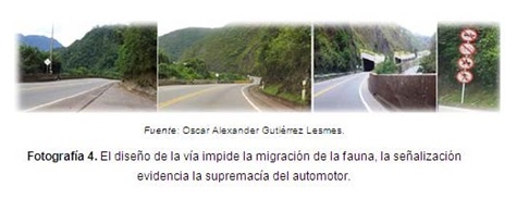 En evidente que la carretera Bogotá-Villavicencio está diseñada exclusivamente para el tránsito de automotores, no hay vía de circulación o corredor para la fauna silvestre, no existe un solo puente o túnel creado para la migración de la fauna en el ecosistema que fragmentó la carretera. Como lo sustentan Morales, Peris & Pedraza (2000) estos corredores actúan como conectores de hábitat a través del paso entre los fragmentos aislados.