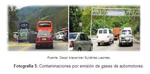 Segundo, la contaminación por la emisión de gases de la combustión de los motores. Según Téllez, Rodríguez & Fajardo (2006) el 80% de las emisiones de monóxido de carbono provienen de los vehículos automotores que utilizan como combustible gasolina o diésel y los procesos industriales. El aumento del tráfico también causará un incremento en contaminación por ruido según Mollinedo (2006). Los automóviles y los camiones son las principales fuentes de contaminación acústica y según Barber et al. (2011) los niveles de ruido afectan el comportamiento de la vida silvestre. Además, Arroyave et al. (2006) y Sánchez et al. (2013) sostienen que el ruido produce desplazamiento, reducción de áreas de actividad y un bajo éxito reproductivo. (Ver Fotografía 5).