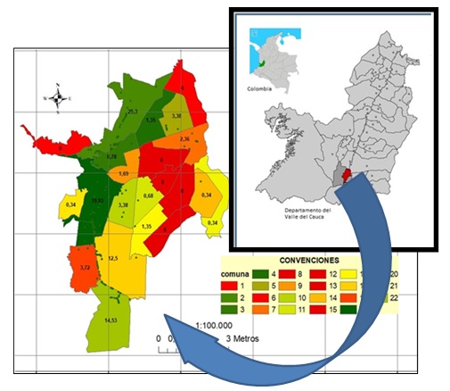El área de estudio corresponde a la zona urbana de Santiago de Cali con coordenadas 3°26′24″N 76°31′11″O, ubicado en el Valle del Cauca; dentro del municipio existen diferentes campus universitarios, entre los cuales el de la Universidad del Valle, en su sede Meléndez, que tiene una extensión de 100 hectáreas; es el segundo campo más grande de Colombia, por la riqueza natural y diversidad cultural que alberga el campus, se le considera patrimonio y hace parte de la estructura ecológica complementaria del municipio (Alcaldía de Santiago de Cali, 2012) (Figura 1). Figura 1. Localización de las comunas en la ciudad de Cali en el departamento del Valle del Cauca (Colombia) Fuente: Los autores