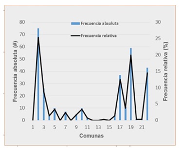 Las especies localizadas en los emplazamientos están distribuidos en las diferentes comunas de Cali. En algunas de estas comunas (p. ej. 1, 8 12, 15) no fue encontrado algún individuo forestal como notable, por lo cual aquí no se hizo la declaratoria de árboles notables (figura 2). Figura 2. Distribución en frecuencia relativa y absoluta de los individuos forestales por comuna. Fuente: Los autores
