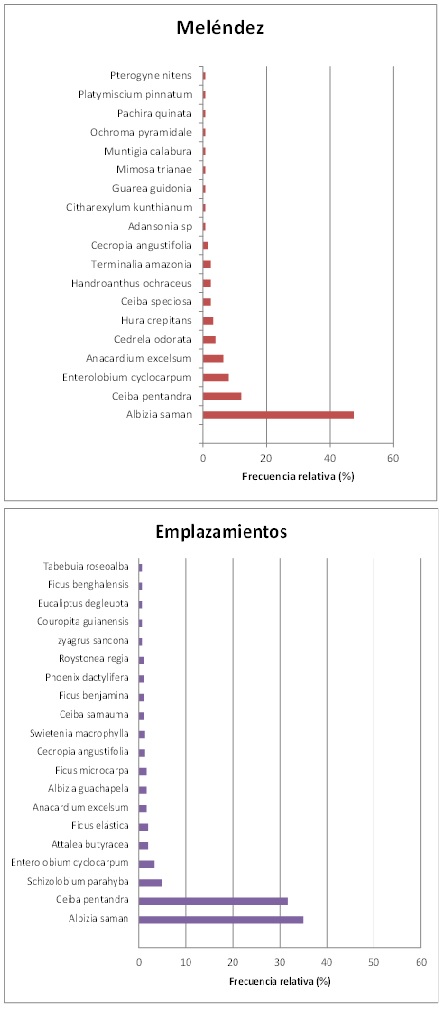 Tabla 1. Veinte mayores frecuencias relativas en el campus de Meléndez de la Universidad del Valle (n = 124) y emplazamientos de Cali (n = 200). Fuente: Los autores