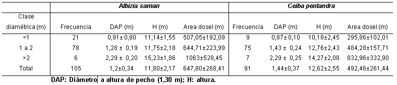 Los valores de altura de las dos especies encontrados en este estudio son mucho menores a los encontrados por Moya y Muñoz (2010) en plantaciones más jóvenes de ocho especies comerciales monitoreadas en Costa Rica, incluso; sin embargo, los DAP de A. saman y C. pentandra (0,99-1,44 m) son valores mucho más altos que los reportados para especies maderables en el estudio citado, que oscilaron entre 0,18 y 0,37 m. También, Tenorio et al. (2016) reportaron alturas mayores y DAP menores de otras cinco especies. Incluido una variedad de samán (Samanea saman) presentó una altura mayor (16,3 m) que la altura media reportada en este estudio y un DAP menor a las especies aquí estudiadas.