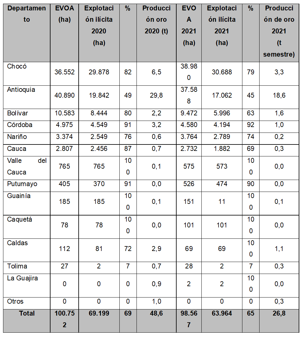 Tabla 6. Producción de oro y explotación ilícita por departamento 2020-2021 Fuente: tomado del Informe de Explotación de oro de aluvión, a partir de percepción remota (UNODC, 2021).