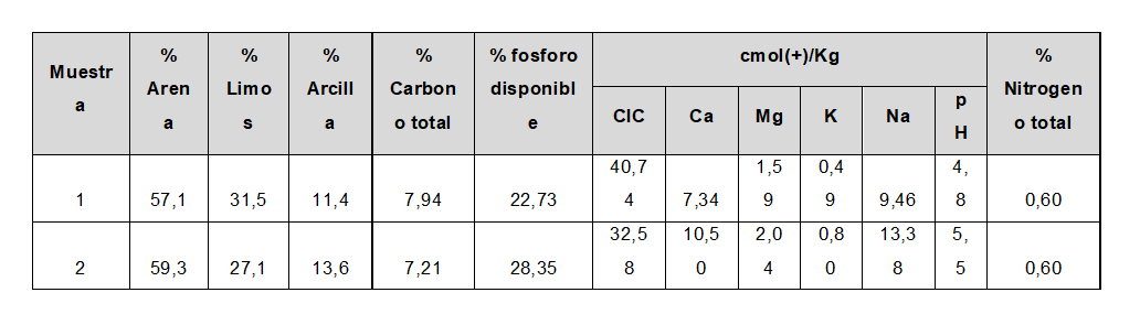 Tabla 1. Resultados análisis químico muestras de suelo de La Isla