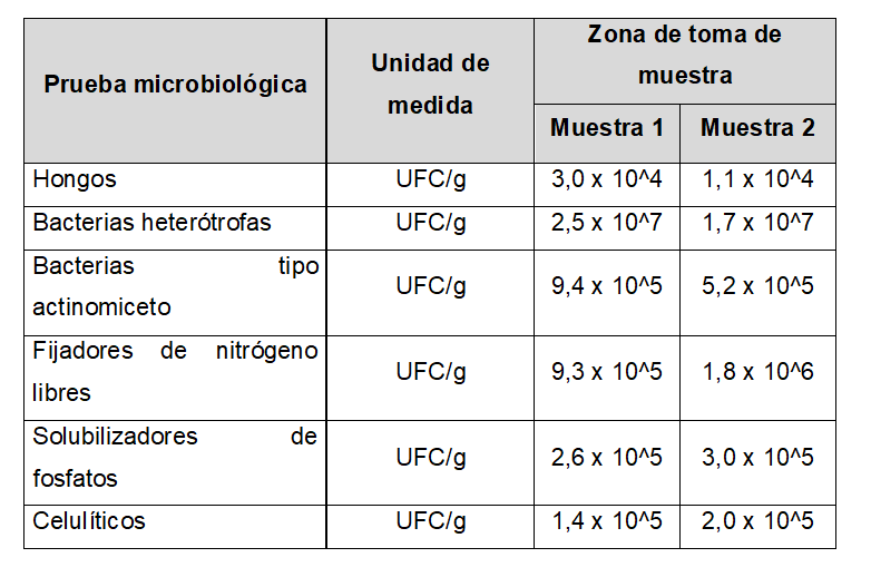 Tabla 2. Resultados de estudios microbiológicos en suelo