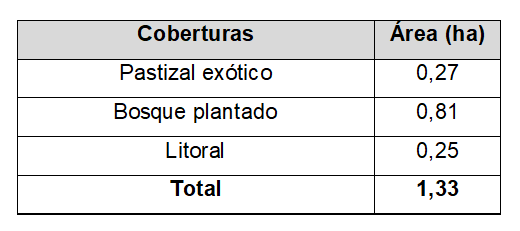 Esta zona presentó tres tipos de cobertura: pastizal exótico dominado por la especie Cenchrus clandestinus (Hochst. ex Chiov.) Morrone; bosque plantado con presencia de especies exóticas como Acacia melanoxylon R. Br., Pinus radiata D. Don, Pittosporum undulatum Vent., Salix humboldtiana Willd. y Corymbia calophylla (Lindl.) K.D. Hill & L.A.S. Johnson, entre otras, y finalmente una zona de litoral donde también se encontró una vegetación dominada por el C. clandestinus en compañía de otras herbáceas (Camacho, 2019).