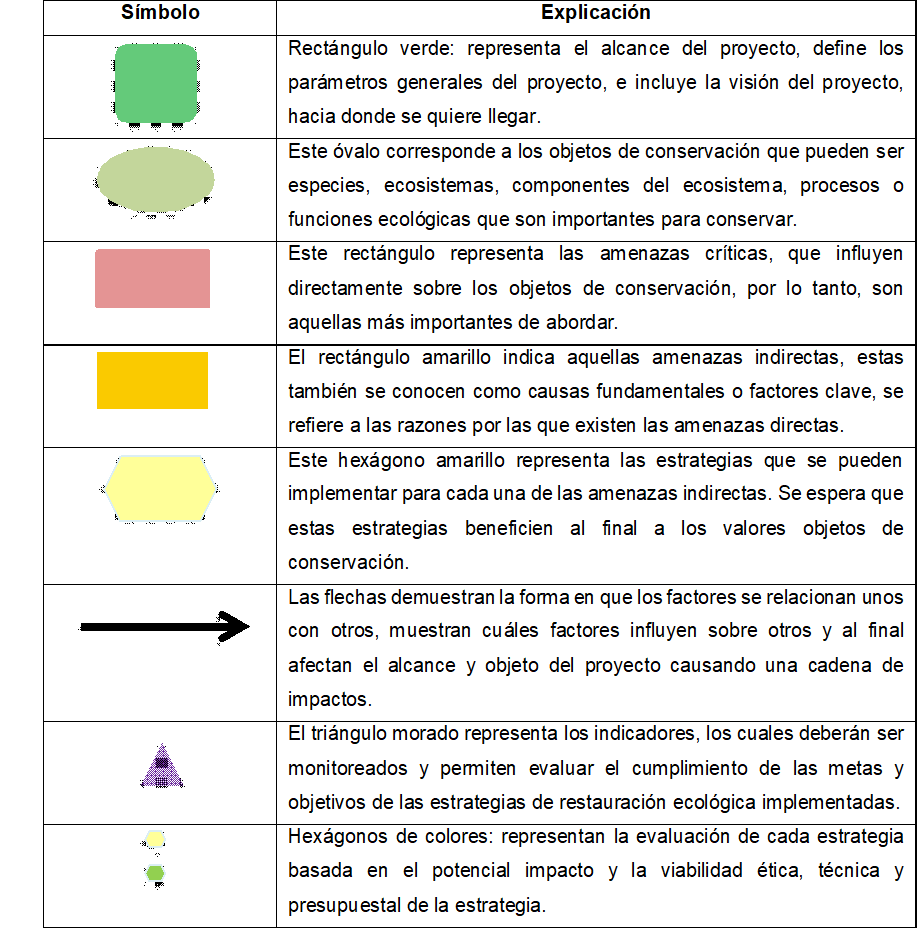 Teniendo en cuenta la información anterior, en la consolidación del modelo situacional o conceptual elaborado para esta área se reconocieron cinco objetos de conservación, para los cuales se identificaron cinco amenazas directas; en cuanto a las amenazas indirectas, se observaron seis. Y, por último, se diseñan o establecen estrategias con las que se pretende disminuir las amenazas que puedan afectar el ecosistema, y de esta manera encaminar la restauración ecológica hacia el objetivo de consolidar un núcleo ecológico para la conectividad y conservación. En la Tabla 4 se explican los símbolos empleados por el programa MIRADI y en la Figura 2 se observa el Modelo Conceptual para el sector La Isla.