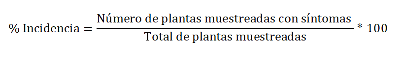 Para las tres enfermedades se muestrearon 50 plantas por campo se anotaba si la planta estaba enferma o no y se determinaba la incidencia de la enfermedad con la siguiente fórmula (Agrios, 2005):