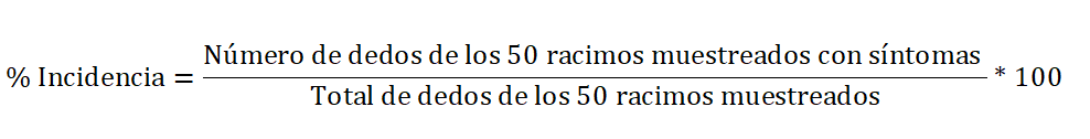 Para ambas enfermedades se determinó la incidencia de la enfermedad en los racimos de las 50 plantas por campo, con la siguiente fórmula: