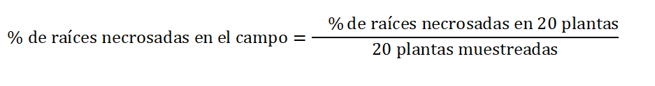 Los muestreos se realizaron en 20 plantas por campo, a las cuales se les hicieron excavaciones entre 5 y 20 cm de la superficie en cuatro sitios del área de plateo de la planta. En cada sitio se extrajeron fragmentos de raíces de 25 cm de longitud para alcanzar 100 cm de cada planta. Las raíces se cortaron transversalmente con una cuchilla fina. Con una regla graduada se midió la longitud total y la necrosada de cada raíz y se sumó. De esta forma, se estimó el porcentaje de raíces necrosadas por sitio y luego por planta de todas las especies de nemátodos. Finalmente, se determinó el porcentaje de las raíces necrosadas con la siguiente fórmula: