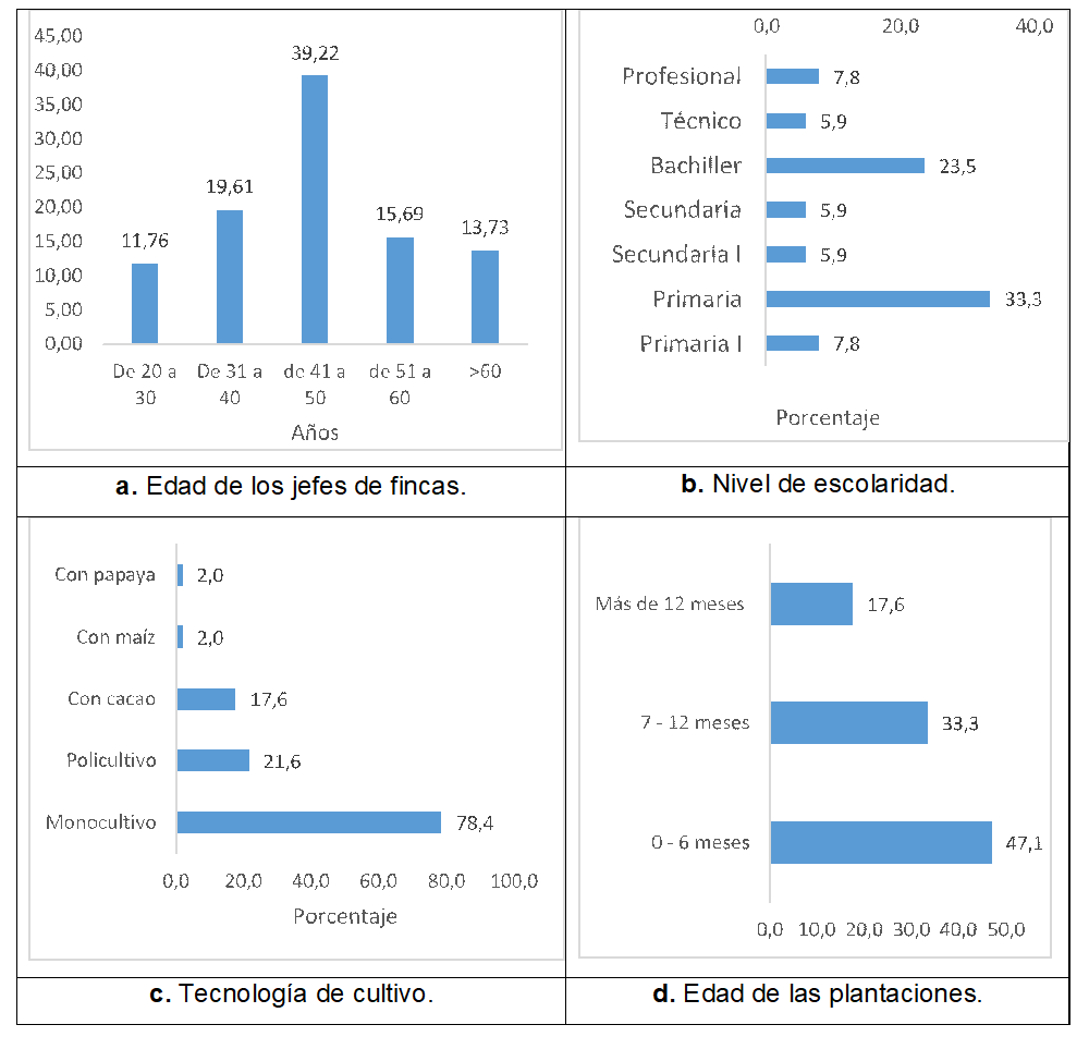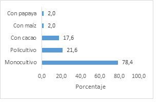 Al analizar las tecnologías implementadas por los agricultores se presenta en gran medida la implementación de monocultivos (78,43%). También se presentaban policultivos con un 21,56%, siendo el cultivo de mayor asocio el cacao empleado en un 17,64%, seguidos de los cultivos de maíz y papaya en una mínima proporción (Figura 1c).