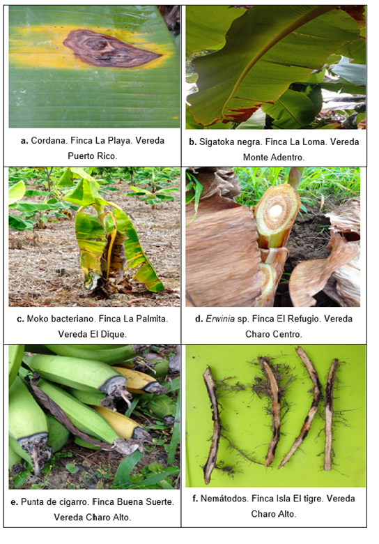 En la Figura 2 se presentan las evidencias fotográficas de las sintomatologías típicas de las enfermedades encontradas en la variedad Hartón, en alguna de las veredas visitadas.