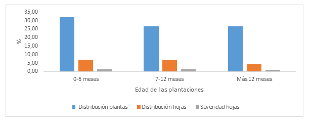 El ANDEVA de la incidencia y severidad de la mancha por Cordana no manifestó diferencia estadística en tres las diferentes edades de las plantaciones, al parecer porque la enfermedad no constituyó un problema serio en las mismas. La incidencia por planta varió desde 31% para las plantaciones de 0 a 6 meses a 26,67% para las de 7 a 12 meses y más de 12 meses. De igual forma la incidencia por hojas fue baja, al no sobrepasar el 7% en ninguno de los tres rangos de edades en estudio, mientras que la severidad también fue relativamente baja, sobresaliendo las plantaciones de 0 a 6 meses con 1,38% (Figura 3).