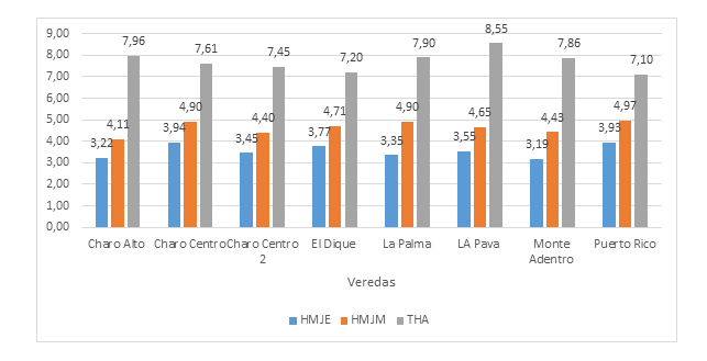 Un análisis de la situación de la sigatoka negra en las diferentes veredas puso en evidencia la presencia de la enfermedad con valores preocupantes de HMJE y HMJM en todas las plantaciones, aunque con ligeras variaciones. La HMJE varió desde un mínimo de 3,22 en Charo Alto a un máximo de 3,94 en la vereda Charo Centro, o sea, siempre por debajo de 4. La HMJM varió desde un mínimo de 4,11 en Charro Alto a un máximo de 4,97 en la vereda Puerto Rico, o sea, siempre por debajo de 5. El THA varió desde 7,20 en la vereda El Dique hasta 8,55 en la vereda La Pava, siendo esta la única vereda que superó el valor de 8 (Figura 5).