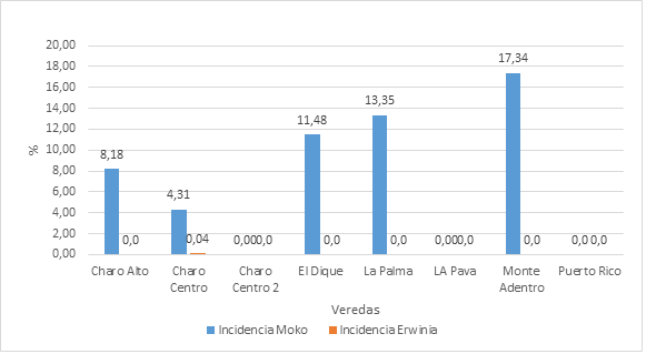 Las enfermedades bacterianas moko y pudrición por Erwinia estuvieron presentes en los muestreos, teniendo una mayor incidencia el moko presentándose en 5 de las 8 veredas muestreadas, con mayor incidencia en la vereda Monte Adentro con un 17,34%, siendo su mínima incidencia 4,31% en la vereda Charo Centro. En esta última vereda también se evidenció la presencia de la pudrición por Erwinia con una incidencia de 0,05% (Figura 7).