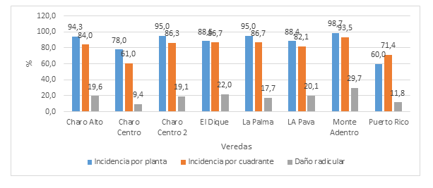 Los daños por nemátodos estaban presentes en todas las veredas (Figura 8), con mayor incidencia por planta en la vereda de Monte Adentro (98,7%), y más baja en la vereda Puerto Rico (60,0%), mientras que por cuadrante se evidencio una mayor incidencia en la vereda Monte Adentro (93,5%) y la menor en la vereda Charo Centro (61,0%). En cuanto a daño radicular se alcanzó en la vereda Monte Adentro un 29,7% siendo esta la mayor incidencia, a diferencia de la vereda Charo Centro que presentó una baja incidencia de 9,4%.