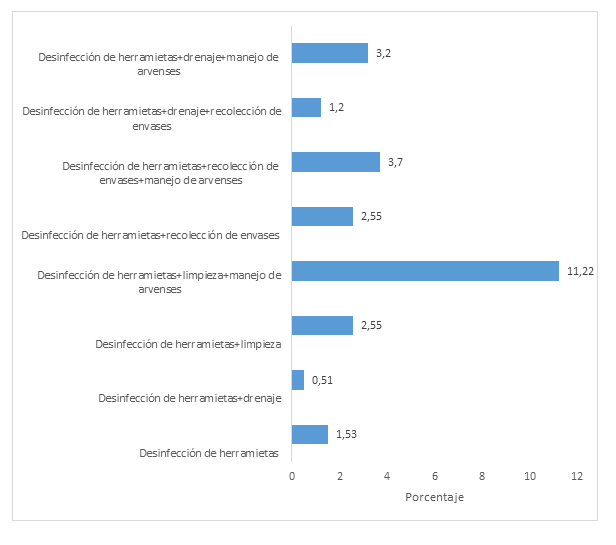 A partir de las encuestas se obtuvo que entre los tipos de manejo que se implementan en las fincas se destaca la desinfección de herramientas, ya sea sola o combinadas con otros manejos como lo muestra la Figura 9 en donde la combinación de las prácticas desinfección, limpieza de herramienta y manejo de arvenses presentó un 11,22%, seguido de la desinfección de herramienta, manejo de arvenses (3,7%) y la desinfección de herramienta, drenajes, manejo de arvenses (3,2%), y otras labores o manejo con menor porcentaje.
