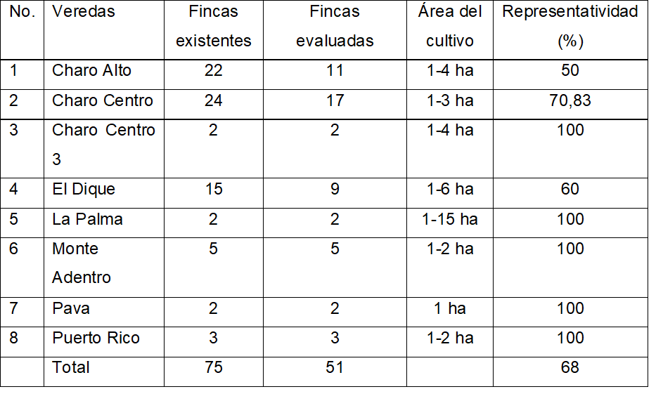 Se visitaron 51 fincas pertenecientes a 8 veredas representando el 68% de las fincas existentes, entre enero y junio de 2023. En la Tabla 1 se muestran los campos muestreados en las diferentes veredas y su representatividad dentro de ASOPLASA.