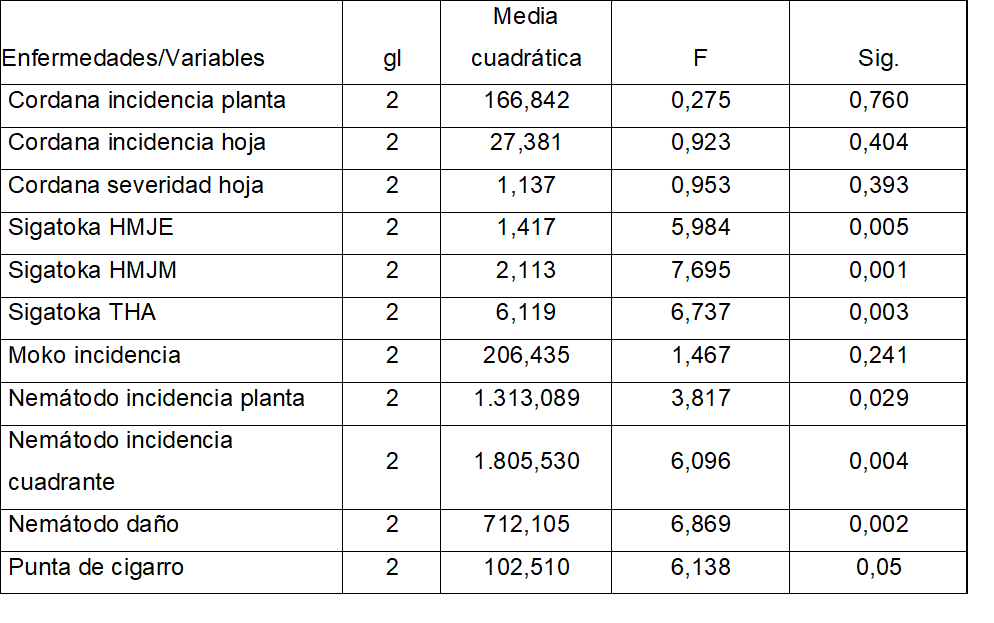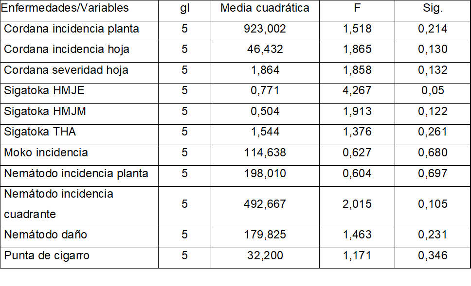 El ANDEVA para los rangos de edades solo arrojó diferencia estadística (p<0,05) para las variables de la sigatoka negra y los nemátodos y no para el resto (Tabla 3), lo cual se explicará más adelante cuando se analicen los resultados de las pruebas de Tukey.