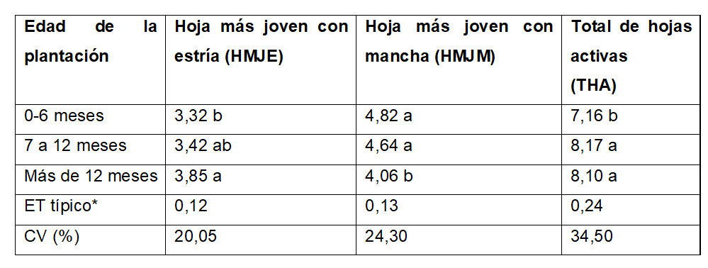 Los resultados del THA son los esperados ya que las plantaciones jóvenes entre 0 y 6 meses generalmente no han expresado o estabilizado el ritmo de emisión foliar de las plantaciones de plátano (una hoja cada 7 a 10 días). A pesar de los niveles de sigatoka presentes, los THA por encima de 8 de las plantaciones de 7 a 12 y de más de 12 meses son indicativo de las afectaciones de la enfermedad sobre la productividad y no son alarmantes según los criterios de Pérez et al. (2014), que plantean que una planta de plátano para expresar todo su potencial de rendimiento debe tener más de 10 hojas activas, pero que una afectación en la producción se puede producir cuando el THA está por debajo de 8.