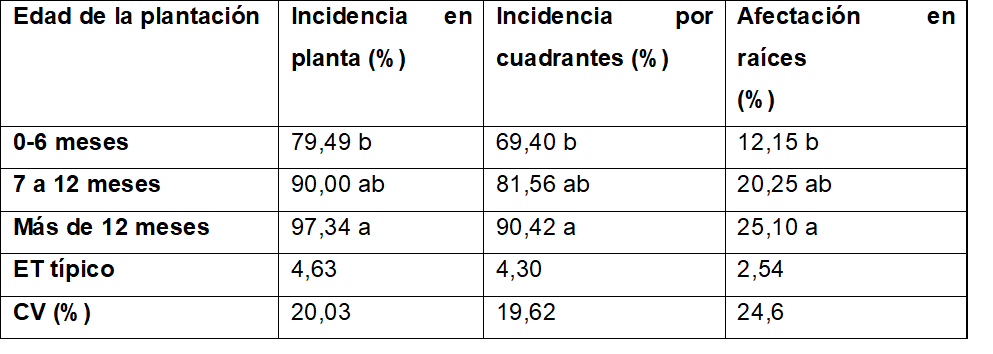 El resultado del ANODEVA arrojó diferencia estadística para las variables de incidencia y daño en raíces de los nemátodos, lo que indica que hay una influencia de la edad de las plantaciones sobre los daños. El análisis de comparación múltiple de las medias (Tabla 5) muestra mayor incidencia por plantas para las plantaciones mayores de 12 meses (97,34%), que son las más viejas, con diferencia estadística con las plantaciones de 0 a 6 meses (79,49), que son las más jóvenes, resultando intermedias desde el punto de vista estadístico las de 7 a 12 meses. La incidencia de nemátodos por cuadrantes también fue mayor para las plantaciones mayores de 12 meses (90,42%), con diferencia estadística con las plantaciones de 0 a 6 meses (69,40%), resultando intermedias desde el punto de vista estadístico las de 7 a 12 meses. De forma similar ocurrió para el porcentaje de afectación de raíces por nemátodos que fue mayor para para las plantaciones mayores de 12 meses (25,10%), con diferencia estadística con las plantaciones de 0 a 6 meses (12,15%), resultando intermedias desde el punto de vista estadístico las de 7 a 12 meses. De forma general, la incidencia por plantas y por cuadrante se considera alta al igual que el porcentaje de daño en raíces de más del 20% que implica que más de la quinta parte de las raíces están afectadas por estos fitopatógenos.