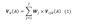 La ecuación (1) representa el valor global de la alternativa respecto a la vereda. La alternativa es cada una de las intersecciones i y j donde V_K(A)  es la combinación lineal de los pesos Wj y el valor de la alternativa V ijk (A), los índices i, j, k representan el índice de indicadores, criterios y veredas, respectivamente, este hipercubo representa la concatenación de alternativas por vereda.
