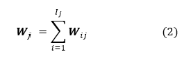 La ecuación (2) representa el valor peso Wj respecto a los criterios j, es igual a la sumatoria de pesos Wij respecto a los indicadores i y los criterios j.